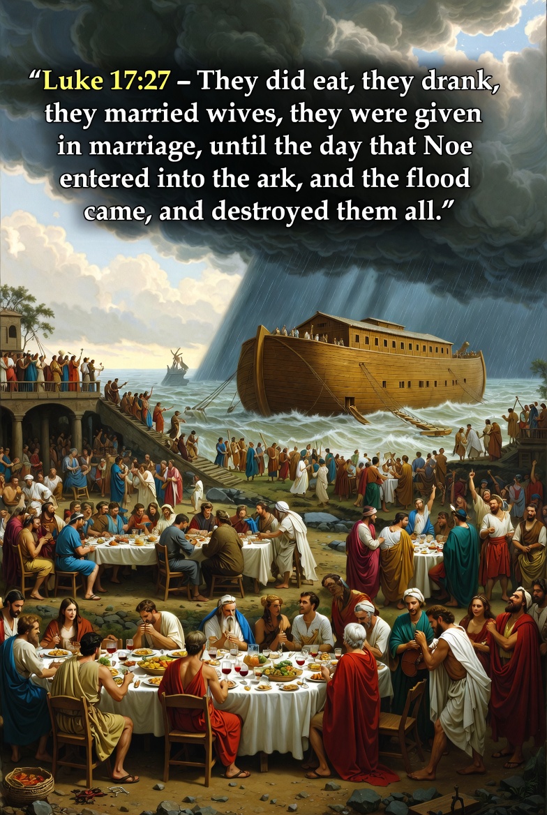 Luk 17:27 They did eat, they drank, they married wives, they were given in marriage, until the day that Noe entered into the ark, and the flood came, and destroyed them all.
